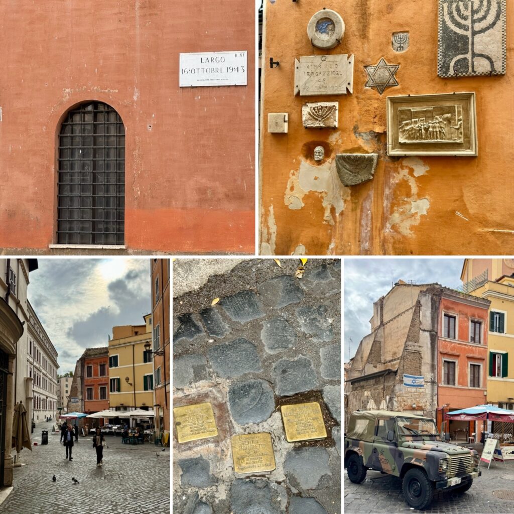 The most important part of the tour talked about the history and how the Roman Jewish community was endeared, then discriminated against in Roman times, then found in favor again until around 1500. In 1555, all Roman Jews were moved into a walled, confined area, eventually known as the Ghetto. Persecuted by the Papal States and the outer community for 300 years, it was actually Napoleon’s invasion that pulled down the Ghetto walls and began the slow process of Jewish emancipation. Eventually Jews were given full citizenship in the late 1800s. But things took a sad turn after the Nazis occupied Italy in 1943. At least 1,000 Jewish Romans were sent to Auschwitz, with only a few surviving. There are small bronze squares in front of homes to commemorate residents that were victims of the Holocaust. This was a more solemn tour, but it is an important history to continue teaching so that we can ensure fascism does not take power again.