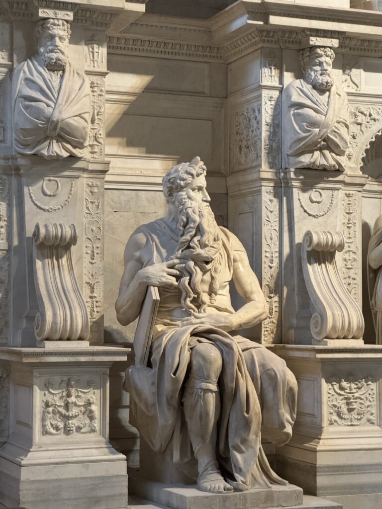 The Basilica of San Pietro in Vincoli was our next stop. Every church in Rome seems to have something amazing in which to lure tourists in. This church has Moses, a large and expressive marble statue by Michelangelo. Restoration was happening but it did not obstruct the viewing area of the statue. There are other things to see in the church like a large ceiling fresco, and a supposed portion of the chains that held Peter captive in Jerusalem.