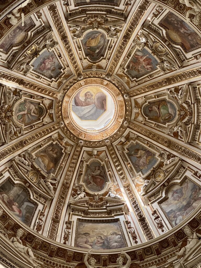 We then walked northward through the heart of Rome. Throngs of people and tour groups hogged the sidewalks. As we have seen before, there is no more shoulder season, and Rome was crowded for the end of October. We weaved our way through smaller lanes and stumbled upon the Saint Ignazio di Loyola church. The church, just around the corner from the Pantheon, was quite busy but was not on our radar at all. It had a gorgeous painted ceiling and a fake dome! When the church was constructed it did not have money to build an actual dome, they instead had expert painters create the illusion of a domed ceiling. There was a long line to take a selfie with a mirror but it is easy to sidestep this line and enjoy the church.