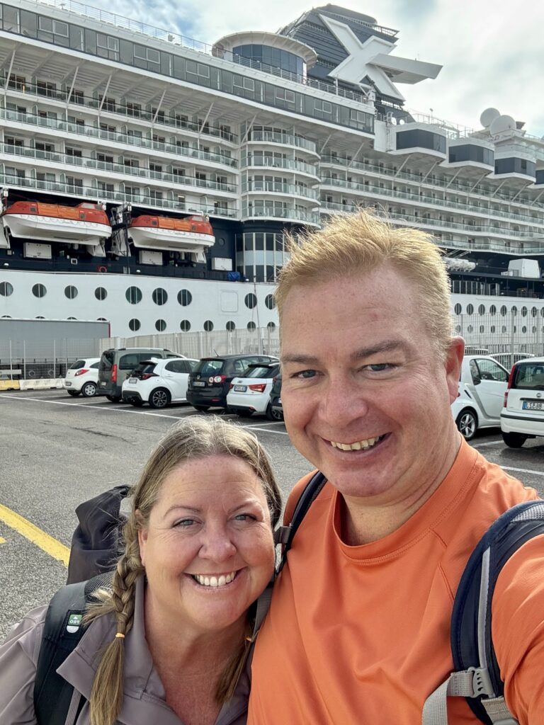 We shared a van with a two other nomad couples that were also in Rome and heading to the ship. Once at the port, we checked in our luggage. But it was early in the day, and we hate standing in line to board ships. Instead we left the port, grabbed some beer and Italian goodies from a supermarket, and sat around Civitavecchia watching the world go by.